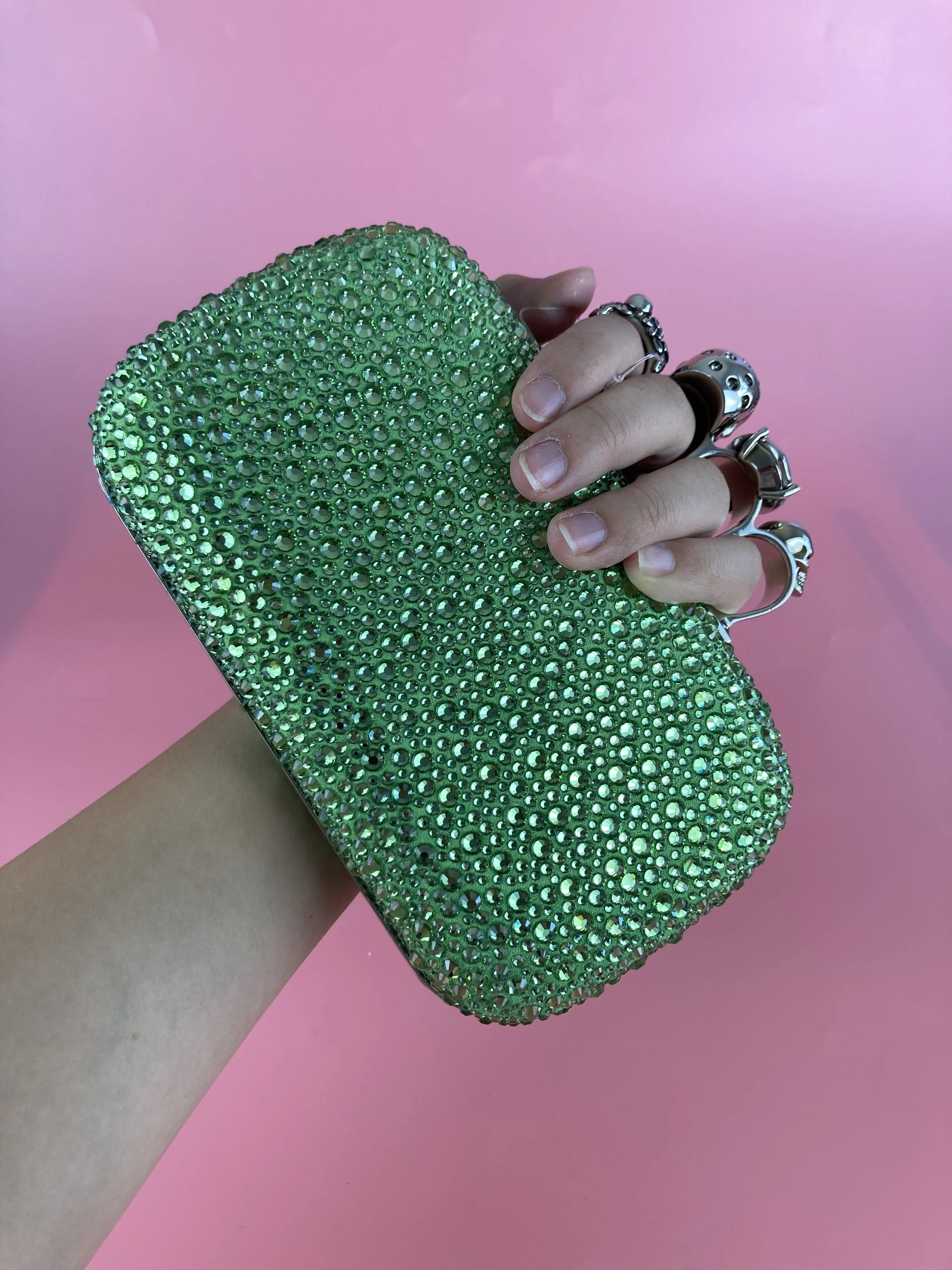 Green ‘Skull Four Ring’ shoulder bag from Alexander McQueen. Crafted from calf leather enriched by glossy crystals, this design secures with a snap and showcases a distinctive knuckleduster handle with a crystal-bejewelled skull emblem, silver-tone metal hardware and one internal compartment.
